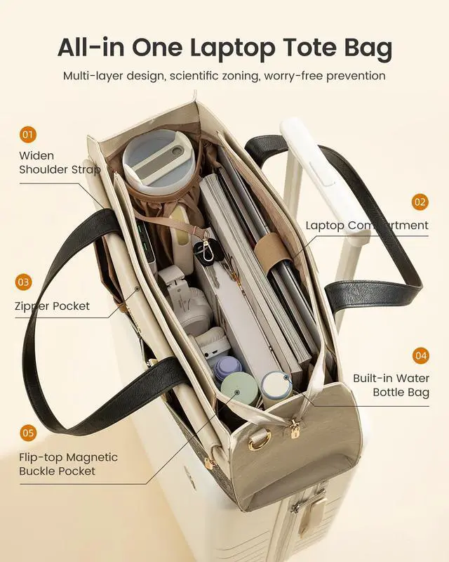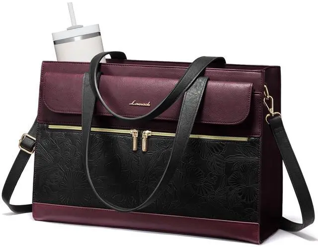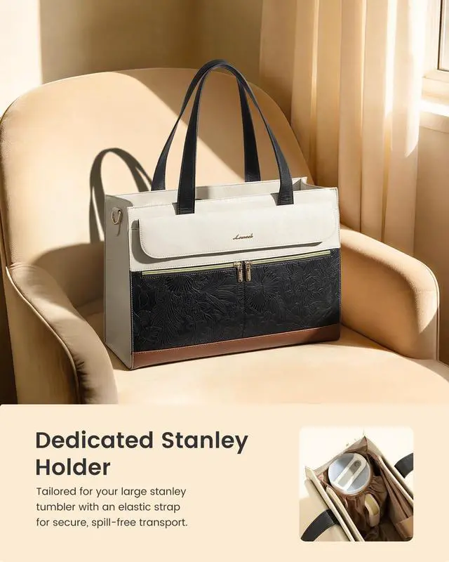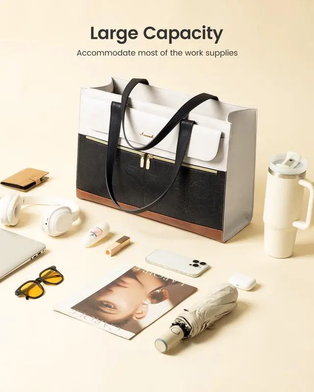 Large Tumbler Pocket Smart Organizer A tall elastic pocket is specially designed to securely hold 3040 oz large tumblers, keeping bottles upright while walking or commuting to reduce tipping and spills. This work tote features a padded laptop sleeve for up to 15.6" devices, a spacious main compartment for documents and daily essentials, plus organizer pockets, pen slots, and side pockets to keep everything neat and easy to access. ^^ Waterproof PU Leather Premium Textured Design Crafted from high-quality PU leather, this womens laptop tote is water-resistant, scratch-resistant, and easy to maintain.