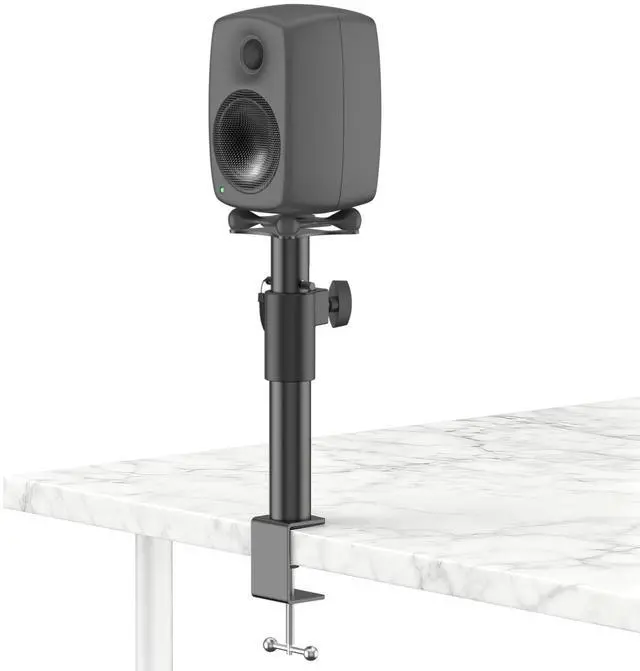 Perfect Compatibility This clamp-on desktop speaker stand is designed specifically for Genelec G2/8020D/8320A speaker stands. Its platform with 4 security mounting points ensures a snug fit for Genelec speaker stands, liminating compatibility concerns. Deliver optimal stability for your speaker desk mount. ^^ Height Adjustment - For Genelec 8020 speaker stands range spans from 10.35" to 13.8", allowing you to effortlessly adjust the speaker stand height to suit your needs. This ensures precise sound positioning across various scenarios, placing the speakers in the optimal listening position to significantly enhance your audio experience. ^^ Cable Management - Our speaker desk stand feature a large cable port measuring 2"H x 1"W, allowing you to neatly organize and conceal charging cables for a clutter-free appearance and tidy desk space.