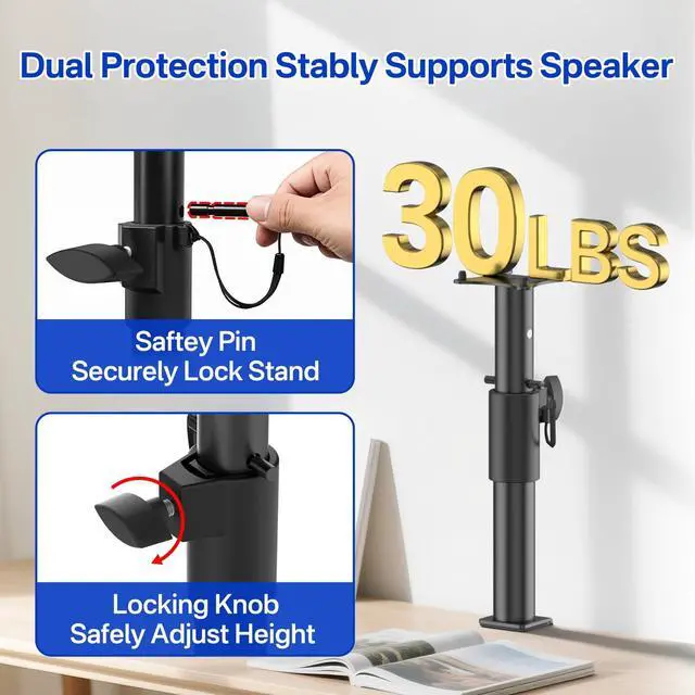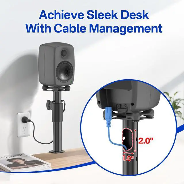 This ensures your speakers remain charged at all times for greater convenience. Seamlessly blending functionality with organization. ^^ Safety & Stability - This speaker stand desk for Genelec G two speaker stand built with heavy-duty metal can safely support up to 30lbs. It features a safety pin that locks the height firmly in place, providing a double layer of protection for your speaker, effectively preventing accidental drops caused by collisions. ^^ Save Desk Space - This studio monitor speaker stands clamp occupies only 2.0 x 2.0 of desktop space while elevating your speakers.
