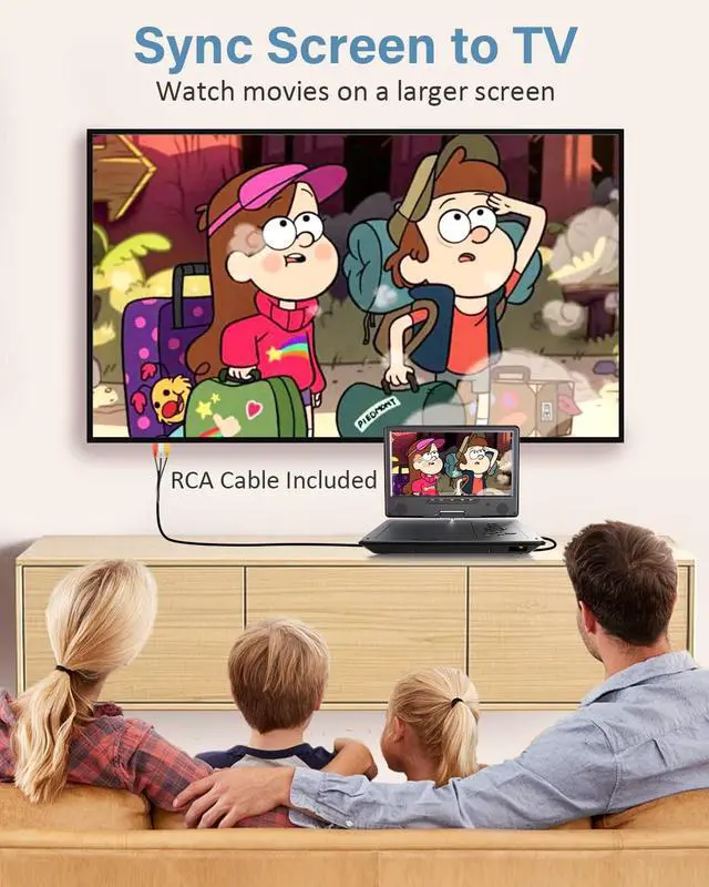 Sync Screen & Louder Speakers: With AV In/Out function, you can connect this portable DVD player to a TV via the included RCA cable to enjoy movies on a large screen with your family. Besides, you can sync screen to similar player to play same movie simultaneously via AV cable (not included). And the built-in dual powerful front speakers will bring you clear and loud stereo sound ^^