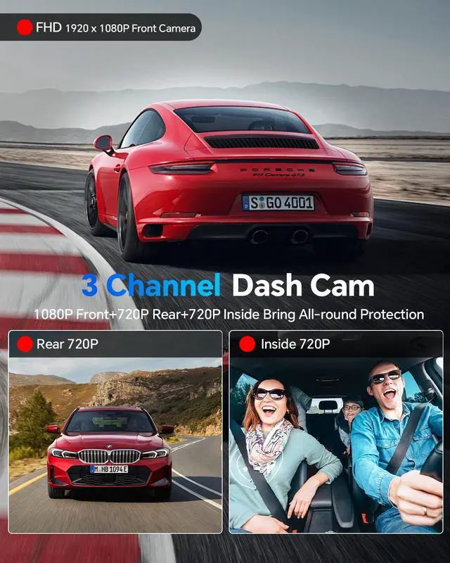 3 Channel Dash CamThis 3 channel dash cam is equipped with three independent cameras: front, interior, and rear. Each camera boasts an ultra-wide viewing angle of 170, 150, and 140 respectively, simultaneously recording the road ahead, the interior of the vehicle. The front camera supports 1080P high-definition video, and the interior camera can rotate 180 for flexible capture of in-car details. The rear camera features a waterproof design and supports external mounting. ^^ Ultra-Clear Night Vision DashcamThis dash cam front and rear inside combines a high-performance sensor with WDR technology, intelligently adapting to day and night environments, capturing license plate details clearly even at night. This dash cam's large F 1.8 aperture automatically enhances light intake in low-light conditions, resulting in bright images with low noise. It features four built-in infrared LED lights, allowing for clear recording of driving conditions even in complete darkness. ^^ Motion Detection and 24-hour Parking MonitorThis dashcam features a highly sensitive vibration sensor. Upon detecting movement around the vehicle or vehicle vibration, it immediately wakes up and records a 30-second emergency video. With 24-hour parking monitor enabled, it can protect your car around the clock, even when the vehicle is switched off and the power is disconnected.