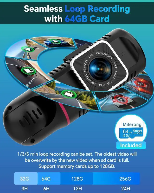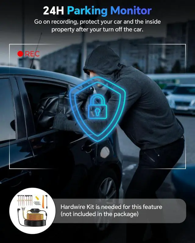 The parking monitor function requires a separate hardware kit, which can be purchased by searching for B0F5WXS33V. ^^ Dashcam with Loop Recording and 64GB Memory Card The dash camera support seamless loop recording, automatically overwriting older videos when the storage is full, ensuring uninterrupted recording. A 64GB high-speed memory card is conveniently included in the package for plug-and-play use.