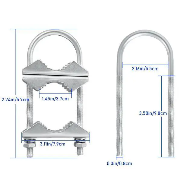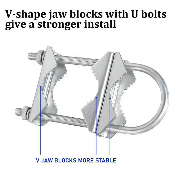 The V-jaw brackets are what makes the assembly so good and secure in bad weather. Using the V jam brackets with U-bolt, the clamp kit can securely hold pipes and antenna tight in place, will not budge in the wind.