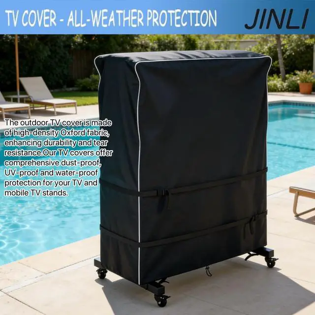 ^^ Material: The TV cover is made of high-density, durable heavy-duty Oxford fabric, featuring wear resistance, UV resistance, color fastness, no cracking, water resistance and dust resistance. It protects your mobile TV from dust, moisture and sunlight, extending the service life of your rolling/mobile TV stand and TV cart.