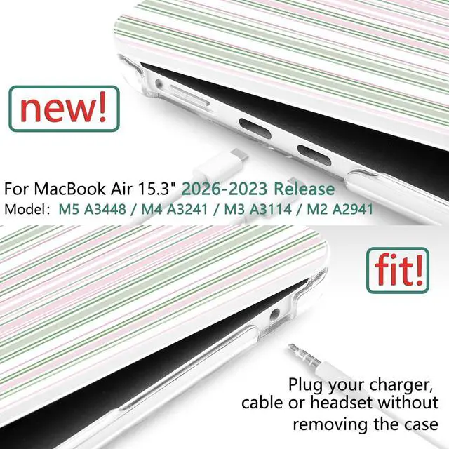 M5 (Model: A3448, 2026 Release). Also fits M4 A3241 (2025), M3 A3114 (2024), and M2 A2941 (2023). Please check the model number "Axxxx" on the bottom of your laptop before purchase to ensure a perfect fit. ^^ [Vibrant Patterns & Long-Lasting Beauty] Features high-definition UV printing with stylish, artistic designs that are resistant to fading, peeling, and scratching. This durable hard shell protects your MacBook Air 15 from daily scuffs and abrasions while showcasing your unique personality with a premium, long-lasting finish. ^^ [Ultra-Slim & Lightweight Design] Crafted from premium polycarbonate, this two-piece snap-on case is tough yet incredibly thin. Weighing only 13.4 oz, it adds zero bulk to your laptop, preserving the sleek aesthetic of the Air 15 while providing a secure, natural grip in your hand. ^^ [Safe Cooling & Precise Access] Fully vented at the bottom for safe heat disbursement to prevent overheating. All ports and features, including magnetic charging port, USB-C, and Touch ID, are easily accessible with precise cutouts. No need to remove the case to plug in your charger, cable, or headphones.