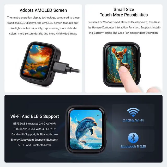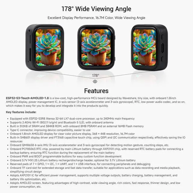 Storage: Offers versatile I/O options, including 7 GPIOs, 1 I2C, 1 UART, and 1 USB port, along with a Micro SD card slot for additional storage. The AXP2101 power management chip provides optimized power distribution, charging, and battery lifespan, while the AMOLED screen offers superior display quality and energy efficiency.