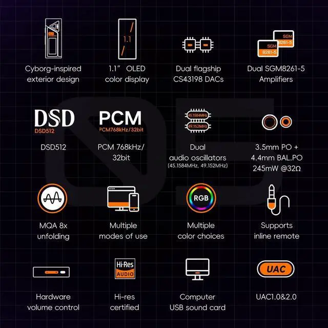 HiBy FC5 Portable Hi-Fi DAC The HiBy FC5 is equipped with a 1.1 OLED color display for easy viewing of operation status at a glance. ^^ The HiBy FC5 features dual CS43198 DACs, dual SGM8261-5 amplifiers, and dual audio oscillators ( 45.1584MH z, 49.152MH z) for superior sound performance. The dual DACs enhance clarity and reduce distortion, while the amplifiers provide powerful, efficient output for various headphones. The oscillators ensure stable, accurate audio by minimizing jitter. Enjoy rich, detailed sound with the HiBy FC5, designed for audiophile-level quality.