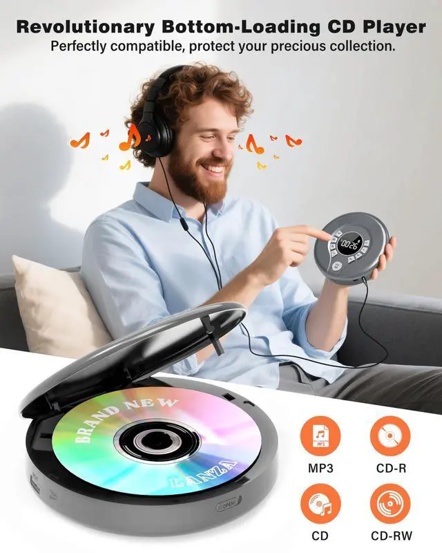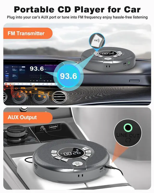 Please Note: For car use, connection is via FM Transmitter or AUX cable; this car CD player does not connect to car Bluetooth systems. No FM Radio. ^^ Skip-Free Sound & Long-Lasting PlayBuilt for life in motion, this small CD player packs 120-sec MP3 anti-skip and a 2000mAh rechargeable battery offering 7+ hours of play. USB-C charging keeps this cd player portable and power-bank friendly. Ideal CD players for workouts, travel, or power outages. ^^ Built-in Speakers & Headphone-Friendly ListeningWhether sharing or solo, this portable CD player with speakers delivers crisp stereo sound for home parties or picnics. Prefer private listening? Use the included headphones or your ownmaking it a great portable CD player with headphones for any scene. ^^ Home & Portable Music HubMore than just a cd players for home, this versatile bluetooth cd player works as a desktop stereo or a go-anywhere Discman. With sleep timer, programmable play, and LCD display, its the all-in-one personal CD player that blends retro charm with modern convenience.