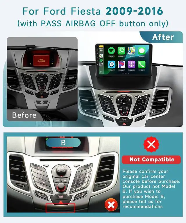 Core 4G+64G: This android car radio is compatible with Ford Fiesta 2009 2010 2011 2012 2013 2014 2015 2016 (with PASS AIRBAG OFF button only), with Canbus, 1280P 2.5D IPS Touch Screen, Android 13 operating system, 4 Core, 4G RAM 64GB ROM. Plug and play. Support steering wheel control, AHD backup camera (package include), OBD/DVR/DAB+ (Not include). ^^ 1280*720 IPS Touchscreen &