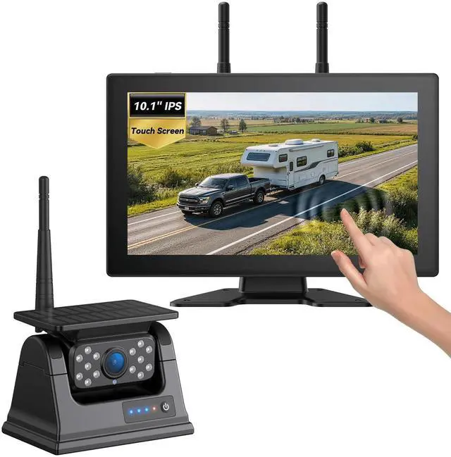 Tip: It is not suitable for metals such as fiberglass or aluminum that cannot be magnetically attracted. ^^ True 15000mAh Long Battery LifeThe portable wireless back up camera has a built-in true 15000mAh rechargeable battery, provides up to 28 hours of use per full charge. And also comes with a 5W solar panel and a 5V/3A Type-C charger, both of which provide the backup camera wireless with longer battery life when the battery is low or the sun is low. ^^ 10.1"T ouch ScreenTruck backup cameras with high resolution can provide super clear and real color image. 10 inch large screen offers a bigger view, making it easier to see obstacles, pedestrians, or other vehicles behind you. Touch screen helps you to set up the monitor and playback recorded videos more easily. ^^ Upgraded Wireless Backup CameraThe back up camera systems for truck built-in more powerful digital signal receiver and frequency hopping technology, greatly reducing the possibilities of frame drop and signal delay. The signal transmission distance of the magnetic wireless backup camera is up to 36ft. ^^ Low-power Solar Backup CameraThe upgraded magnetic backup camera now syncs automatically with the monitor.