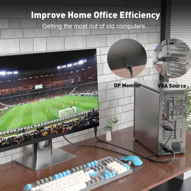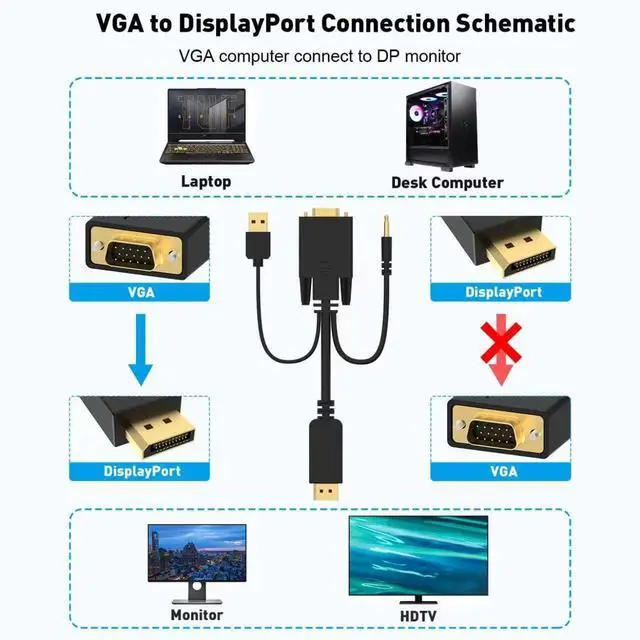 Audio Output: The adapter comes with a 0.6 -meter AUX cable that makes it easy to transfer audio through its 3.5 mm audio port for clear sound quality. You can connect the VGA plug to a variety of VGA signal output devices, such as set-top boxes and desktop computers. Then connect the DP port directly to a monitor, TV or projector.