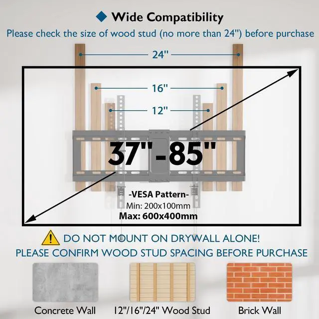 WIDE COMPATIBILITY FOR LARGE TVS: Compatible with most 37 to 85 inch LED LCD OLED flat and curved screens this TV wall mount supports VESA from 200x100 to 600x400mm including 43 inch TV wall mount 50 inch TV wall mount 55 inch TV wall mount 65 inch smart TV and 75 inch TV. ^^ HEAVY DUTY SUPPORT FOR PEACE OF MIND: Constructed from durable cold rolled steel this tilting TV mount securely holds up to 132lbs ensuring stable support for wall mount TV bracket setups in living rooms bedrooms or offices. ^^ LOW PROFILE DESIGN SAVES SPACE AND LOOKS CLEAN: This low profile TV wall mount holds your display only 1.5 inches from the wall offering a space saving layout and sleek design perfect for apartments or small space dwellers using 60 inch smart TVS. ^^ TILTING FUNCTION REDUCES GLARE AND NECK STRAIN: Offers 1 degree upward and 8 degree downward tilt to reduce screen glare and improve viewing comfort ideal for ceiling TV mount setups and fixed TV wall mount preferences in home theaters or bedrooms. ^^