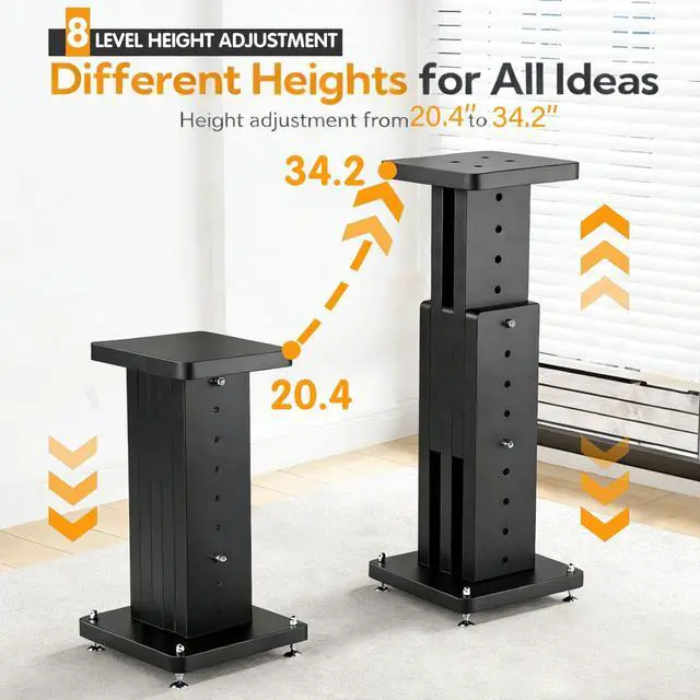 Multiple Height Adjustments: Offering a wide height range from 8.6 to 34.2 inches, these bookshelf speaker stands (pair) allow easy positioning of your speakers at the optimal listening heightwhether placed on desktops, TV cabinets, low sofas, high chairs, or directly on the floor