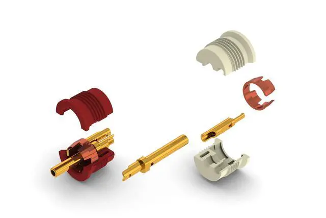 Mechanical structureThe C ring is placed in the groove near the interface end of the lower cover body. The contact pin and the ground pin pass through the C ring in sequence and put them into the lower cover body. Close the upper cover body and the lower cover body to complete the assembly of the body set. The body set and the shell are locked to each other with screws. The sleeve is fixed on the end of the shell with screws. Screws with the finished products. (4/3mm 4 screws per each.