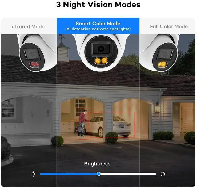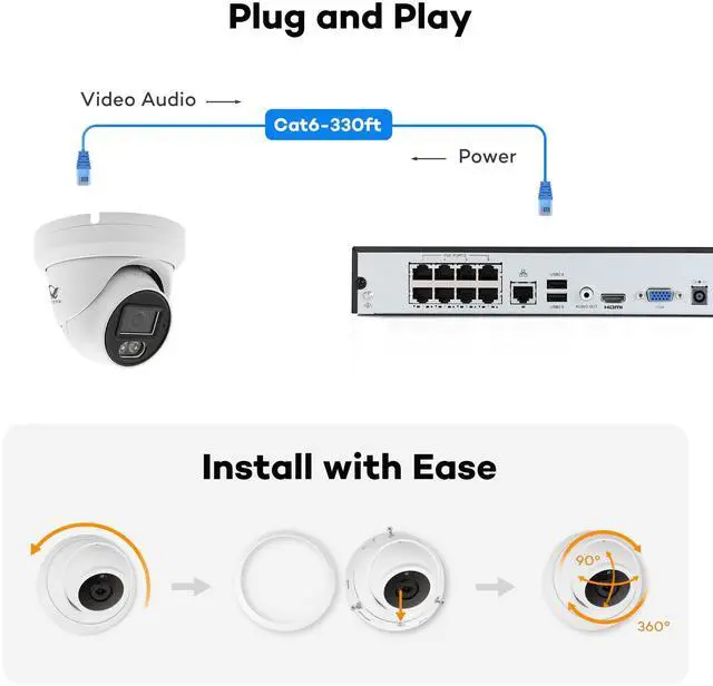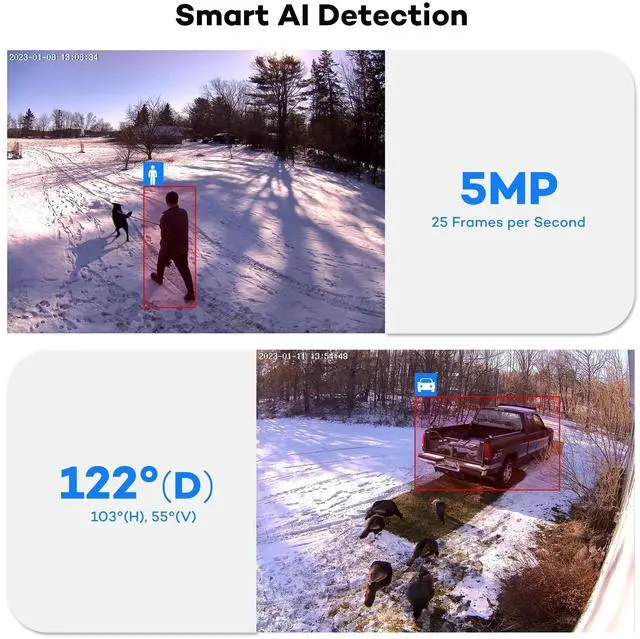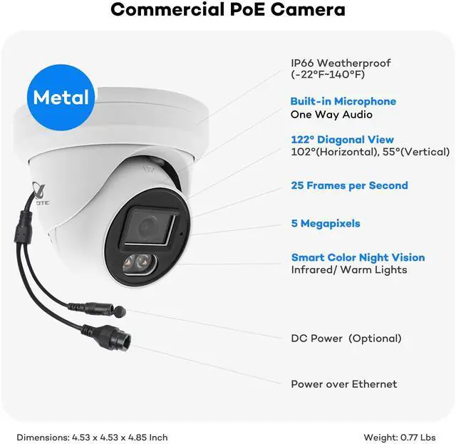 5MP Superior Definition-- 5 million pixels, 122 diagonal field of view. ^^ Smart AI Human Vehicle Detection-- Reduce false alarms and save storage space. ^^ Smart Color Night Vision-- AI human vehicle detection activate bright spotlights, deliver color night vision. ^^ Capture and Record Audio-- Cameras capture sound and NVR record it. Output audio to a HD TV or mobile APP. ^^ IP66 Durable Housing-- Metal housing, indoors or outdoors, fully weatherproof. ^^ Infrared Lights-- Enable infrared lights automatically at night, IR night vision up to 100ft. ^^ Add-on to ONWOTE System-- Work with ONWOTE 12MP/ 8MP/ 6MP PoE NVR or PoE switch with 48V-54V power supply.