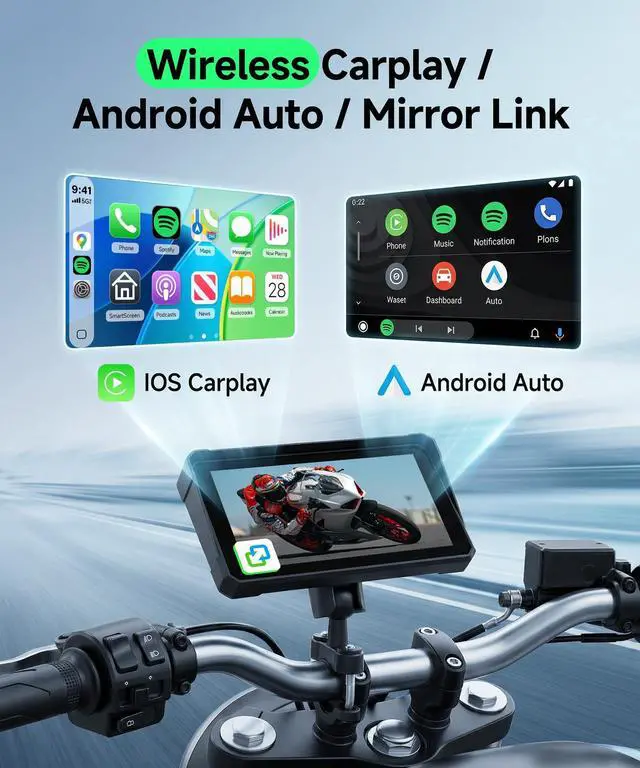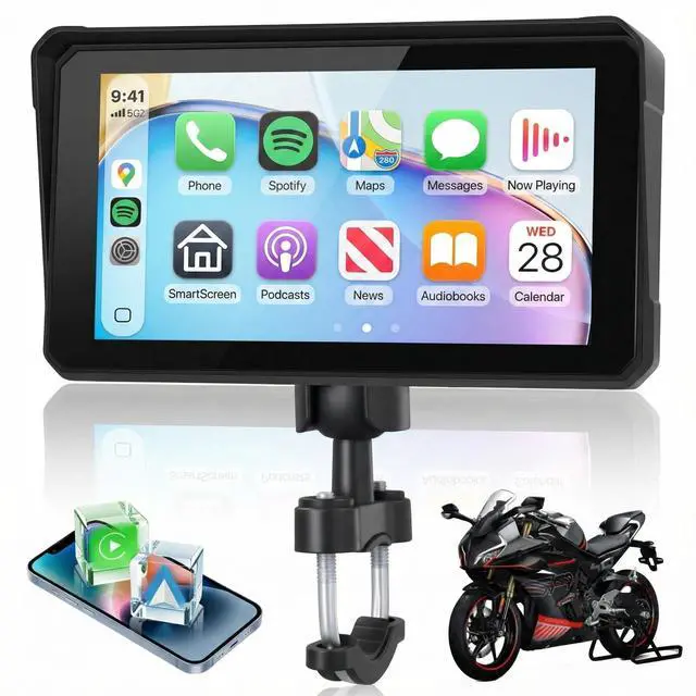 Wireless CarPlay & Android Auto for MotorcyclesThe motorcycle CarPlay Screen offers CarPlay and Android Auto functionality. By wirelessly connecting your smartphone to your motorcycle's touchscreen via Bluetooth, you can easily access map navigation, phone calls, music playback, text messaging, and more with the assistance of Siri. With hands-free control, you can stay focused on the road and ride safely ^^ Dual Bluetooth - Audio & TransmissionMotorcycle Android Auto Screen features built-in Bluetooth connectivity, allowing you to pair the CarPlay touchscreen with your smartphone and Bluetooth-enabled headset or helmet. You can make hands-free calls or enjoy your favorite music without removing your helmet ^^ HD 6-inch IPS Touchscreen & IP68 WaterproofMoto Car Play Screen comes with a 6 inch 1440*720 HD IPS touchscreen, which offers higher color intensity, a more intuitive display, and a more responsive touch than the regular 5-inch carplay motorcycle.