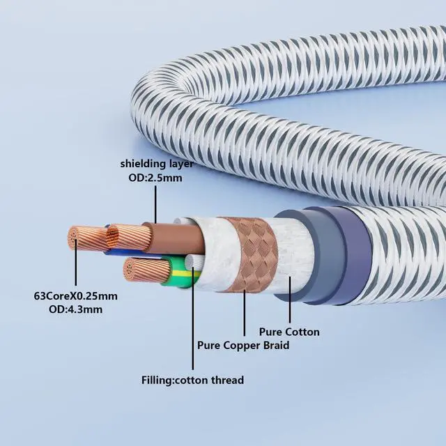 Premium MaterialMade of ultrapure copper with multiple conductors hifi power cable, it is a perfect replacement for old, unreliable power cables. Power cable is 12 AWG highend highfidelity power cord, universal power cord with an outer diameter of 16 mm. ^^ Outstanding Audiophile Power CordAudiophiles power cable Internal PE Insulation Layer + 100% aluminum foil+External PVC Insulation Layer AC mains cord for outstanding rejection of EMI and RFI, Amplifier power cord greatly reduces noise and seamlessly transmits stereo audio for high quality sound, make the sound clearer and fuller. ^^ Goof Performance3 conductor shielded power cable Using 5N Oxgen Free Copper material can improve the clarity of the playback sound and improve the sound quality of the playback sound, enhances the entire audio system with wider dynamics.