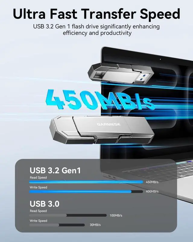 High-Speed SSD Performance: Powered by USB 3.2 Gen 1 technology, this GARMESE USB SSD flash drive delivers read speeds up to 450MB/s and write speeds up to 400MB/s. Effortlessly handle large files such as 4K videos, high-resolution photos, game data, and work documentssaving time and improving productivity. Actual speed may vary depending on device and usage conditions. ^^ 2-in-1