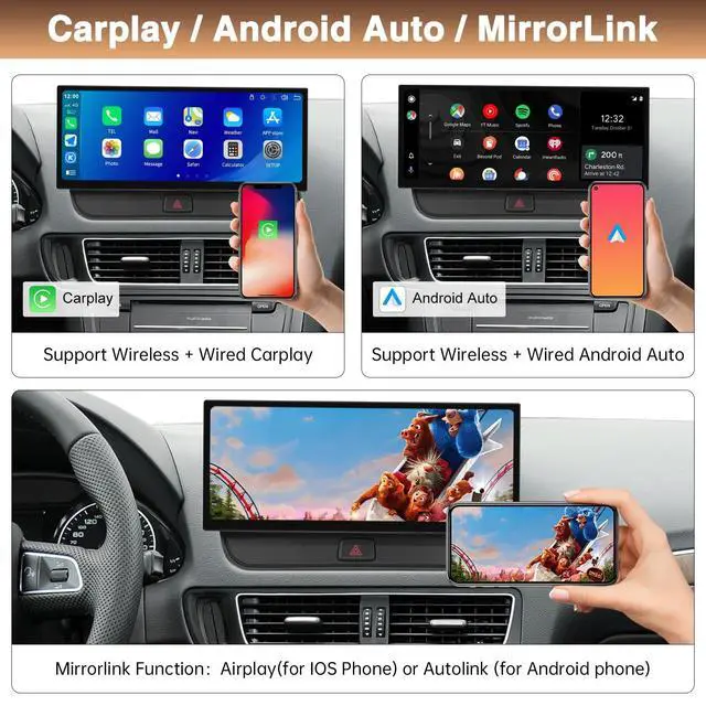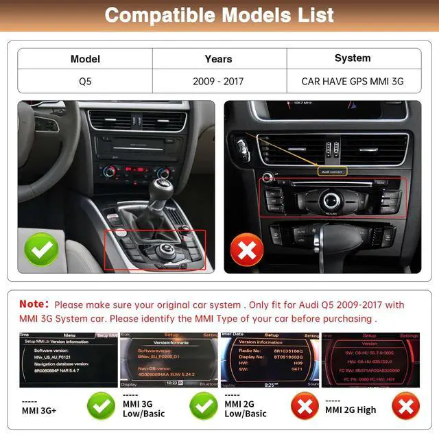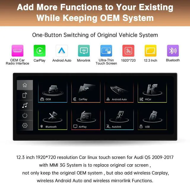 ^^ Car Upgrade Screen for Audi Q5 Built-in Wireless/Wired CarPlay and Android AutoUse your phone in safety while you drive. By simply saying ""Hey Siri"" or ""OK Google"", to get directions, make calls, send & receive messages, and enjoy your favorite music. Get access to voice commands, Siri & Google Assistant can help you do all of these things. ^^ Dual Systems for CarNot only retain the original OEM system functions, but also add wireless Carplay, Android Auto and mirrorlink Functions. One-click Dual-system Switch Seamlessly switch between Linux and original car systems.