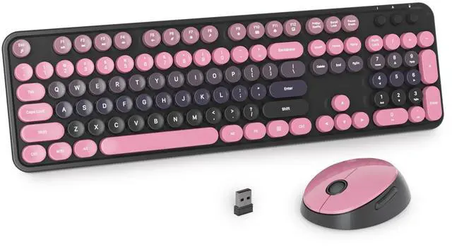 ^^ Wide Compatibility: This full size wireless typewriter keyboard and mouse is compatible with PC, laptop, and computer, making it versatile and suitable for various devices. Whether you're working, gaming, or browsing the web, this combo is designed to meet all your needs. ^^ Auto Sleep and Long Battery Life - This Gradient Black Pink Wireless Keyboard Mouse features Auto Sleep Mode, automatically conserving energy after 5-8 minutes of inactivity. With its long battery life, you can enjoy extended use without frequent recharging or battery replacements.