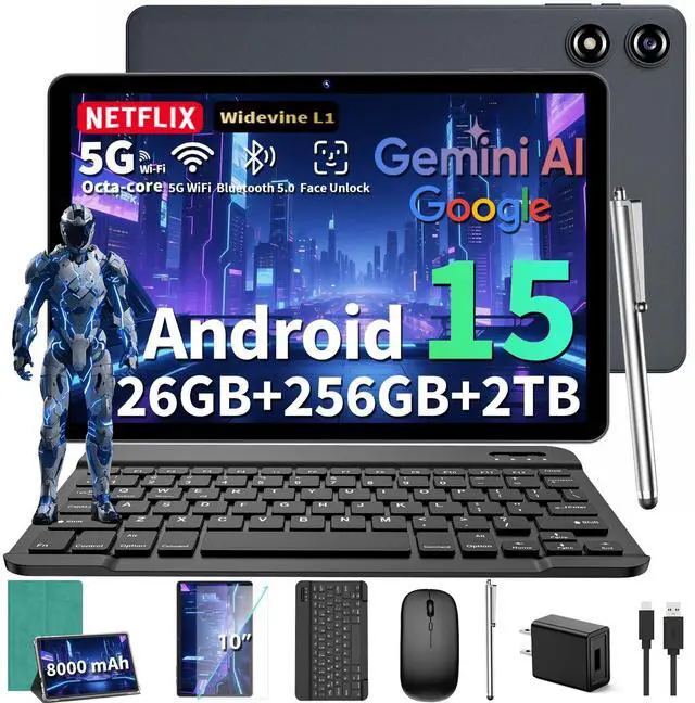 SECURE: The new tablet with Keyboard bundle is powered by the fast, smart and secure Android 15 OS with powerful built-in 3562 Octa-core processors for an efficient and smooth streaming experience. No hassle from Bloatware. This Android tablet comes with the Gemini AI engine, enjoy intelligent task optimization, faster app response, and smarter performance. Dual-band 2.4G /5G Wi-Fi offers faster speeds and minimizes network latency. Bluetooth 5.0 enables seamless wireless pairing with headphones, speakers and other accessories ^^ IMMERSIVE CINEMA EXPERIENCE HD IPS DISPLAY & SMART LENS: The tablet features a 10.1 -inch IPS display that delivers vivid visuals with crisp details. Certified by Widevine L1, it supports 1080P HD video playback on platforms like Prime Video, ensuring immersive streaming. 13MP rear camera and 5MP front camera help you capture life's beautiful moments with clarity. Powered by Android 15, the Smart Lens feature enables text recognition and translation along with object identification. The GPS positioning system provides precise navigation and location services, making it an ideal companion for travel and outdoor adventures ^^ STABLE CONNECTIVITY AI CAMERA & 5G