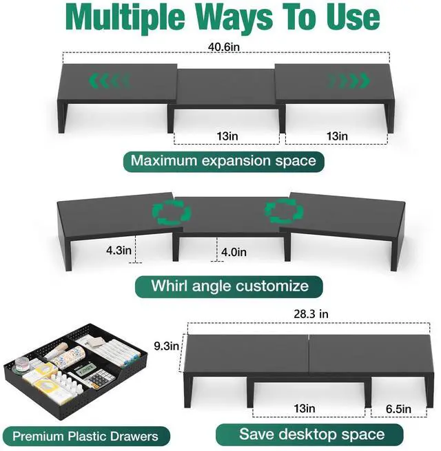 Ergonomic Comfort for All-Day Work Elevate your monitor to the perfect eye level with this OPNICE dual monitor stand. Reduce neck and eye strain, improve posture, and stay focused during long work or study sessionsyour productivity just got an upgrade. ^^ Maximized Desk Organization Keep your workspace clutter-free with the drawer that stores pens, notebooks, and office essentials. This monitor stand doubles as a smart desk organizer, giving you more space to work efficiently. ^^ Durable & Stable Construction Built from high-strength metal, this dual monitor stand supports two monitors or a laptop + monitor setup with ease.