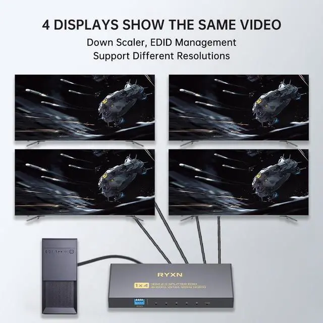 HDMI 2.0 Splitter 1X4This is HDMI 2.0 Splitter 1x4 which supports 4K@60Hz, 2K@144Hz and 2K@120Hz, it copies/mirrors 1 video to 4 display devices. This is HDMI splitter, not HDMI extender.
