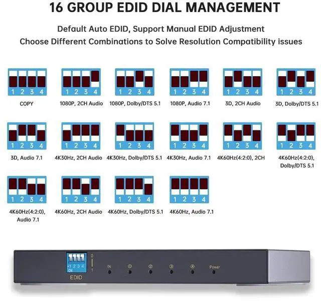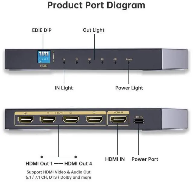 Note: HDMI 2.0 cable must be used. ^^ 4K&1080P Mixed ResolutionThe 2 Port HDMI splitter supports mixed 4K and 1080P resolutions with EDID management and Downscaler. The device will automatically check the EDID information of the TV and adapt to the resolution automatically. (Mixed output of 720P is not supported. 720P must be consistent to output). Resolutions can be mixed, but refresh rates cannot be mixed, e. g. 60Hz and 60Hz, refresh rates must be consistent. ^^ EDID Management Adopt 4 Position EDID dip switch, 16 kinds of EDID mode. There are multiple modes and multiple resolutions to choose from. (Please refer to the manual for multiple modes) ^^ HDMI Audio DirectHDMI output port supports audio passthrough, which can output audio separately and connect with Soundbar (HDMI in) directly. It supports multiple audio formats in 4K format. You can connect other devices such as PS5/PS4 to the HDMI splitter, connect 1 output to the display device, and connect 1 Soundbar to the game to enjoy 4K images and Dolby HD sound.