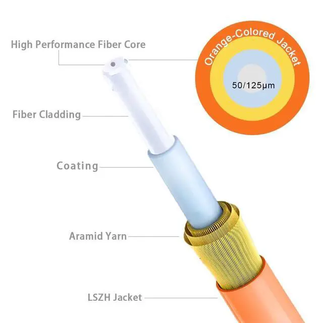 100ft/31m OM2 LC-LC Fiber Patch CableThe 50/125m OM2 multimode bend insensitive fiber optic cable is less attenuation when bent or twisted compared with traditional optical fiber cables and this will make the installation and maintenance of the fiber optic cables more efficient. OM2 LC LC fiber patch cable save more space for any places fiber patch cables are needed. ^^ Wide UsageOM2 LC-LC Fiber Optic Patch Cable Multimode 1Gb is designed for high density applications in gigabit ethernet, fiber channel, local area networks, data center, premise installation, wide area networks, commercial and so on.