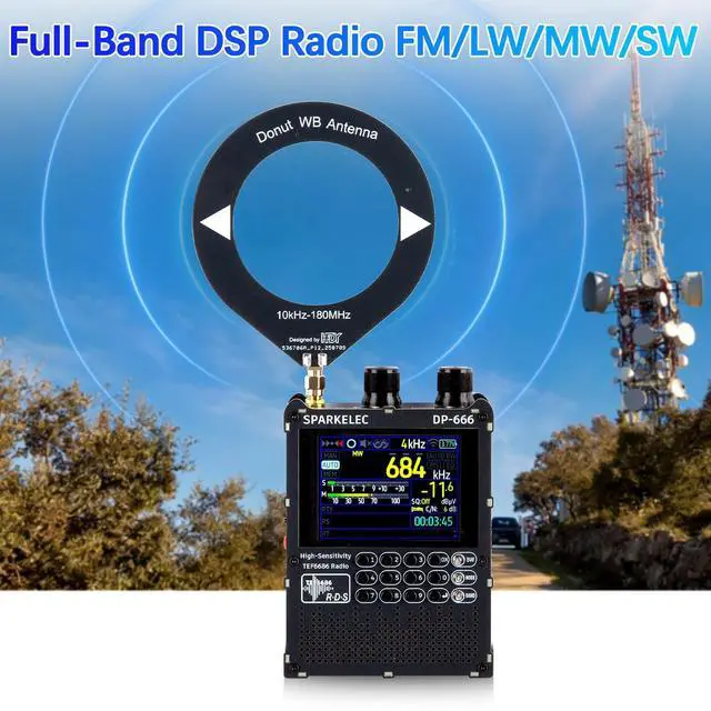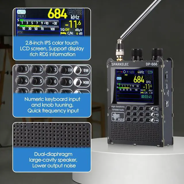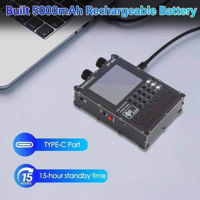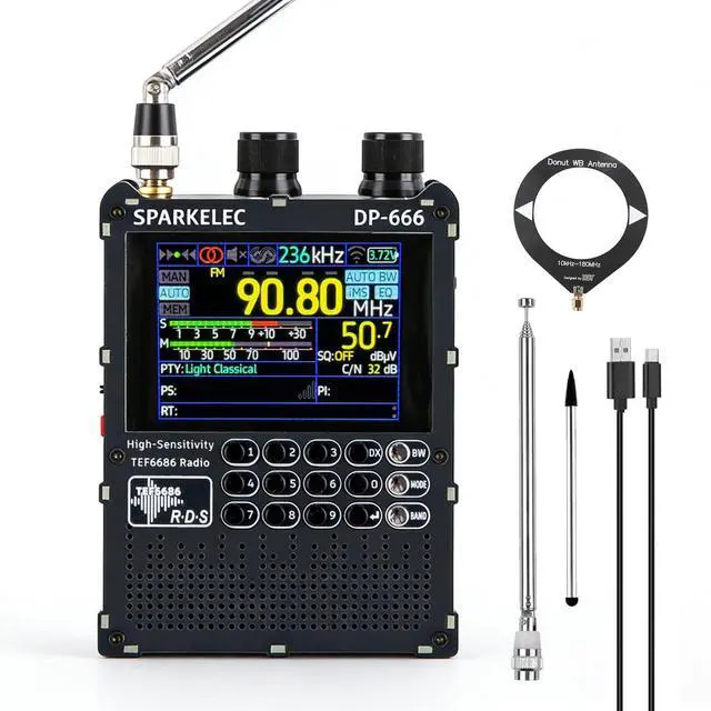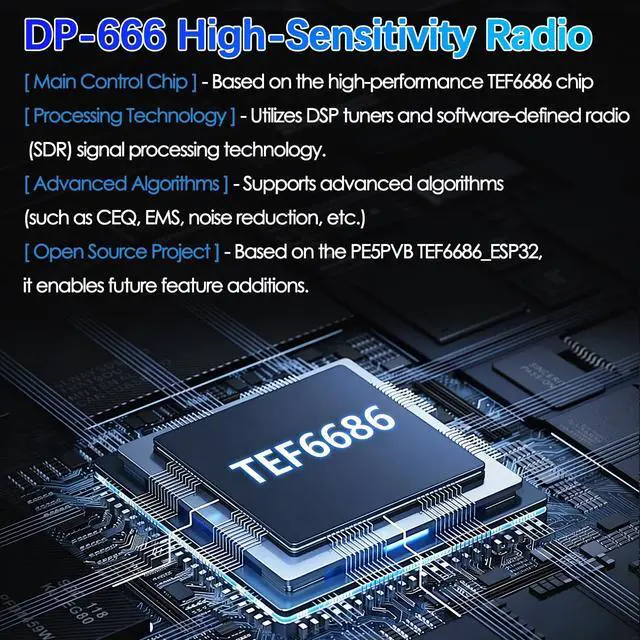 DP-666 2.8 -inch IPS touch screen full-band high-sensitivity DSP radio FM/LW/MW/SWBased on the high-performance TEF6686 chipFM/LW/MW/SW full-band DSP radio 2.8 -inch IPS full-view touch LCD screenDual-diaphragm large-cavity speaker5000mAh battery 3.5 mm headphone outputSupport the display of rich RDS informationOpen source codeThe firmware is upgradableTYPE-C port charging and firmware upgradeThe ESP32 BOOT button is reserved on the outside Built-in antennasShipping list1. Host2. SMA telescopic antenna3. Stylus3. TYPE-C data cable4. Storage bag5.