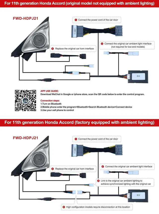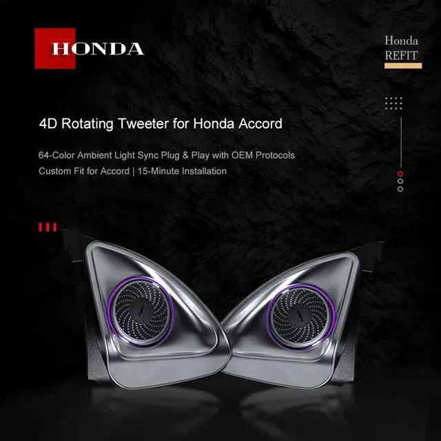 Plug-and-Play for Honda Accord 11th This tweeter is designed for a perfect OEM integration. You won't need to cut wires or make any permanent modifications. The simple installation process makes it easy for anyone to upgrade their car's interior. ^^ OEM-Grade Harness DesignCrafted specifically for your Honda Accord, the molding guarantees a precision fit. This eliminates any gaps or loose parts, providing a clean, factory-installed look with zero damage to your vehicle's trim. Connecting directly into your car's factory audio ports. ^^ Smart APP ControlTake full control of your lighting with our smart app, compatible with both iOS and Android.