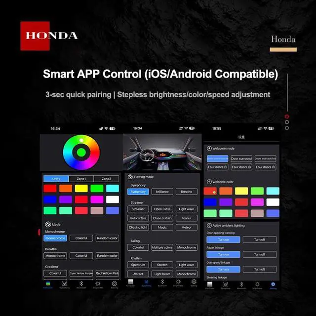 Pairing is quick and easy, so you can start customizing your car's ambiance in just 3 seconds. ^^ Stepless AdjustmentOur app allows for stepless adjustment of brightness, color, and speed, giving you the freedom to create a unique atmosphere that matches your mood. Choose from a variety of lighting modes to suit any occasion. Whether you want a dynamic light show or a subtle glow, you can find the perfect setting to enhance your drive. ^^ SGS Blue Light CertifiedDrive comfortably, day or night. This system is SGS blue light certified, meaning it is flicker-free and designed to reduce eye strain, providing a safer and more enjoyable experience for you and your passengers.