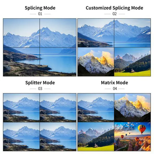 Work as Seamless HDMI Matrix 4x4Arvitek hdmi matrix switch 4 in 4 out has 3 display modes: Video wall controller, Seamless hdmi Matrix and hdmi Splitter. Support Resolution up to 4K@60Hz.