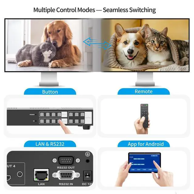 Multiple Control Menthols5 Control menthols: Support WEB GUI, Button, RS-232, LAN, IR remote, Software, app for Android. Support customized scenes preset management(Up to 16 scenes), recall and perform scene rotation function at any time.