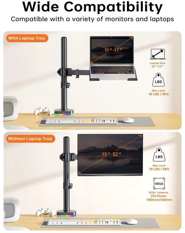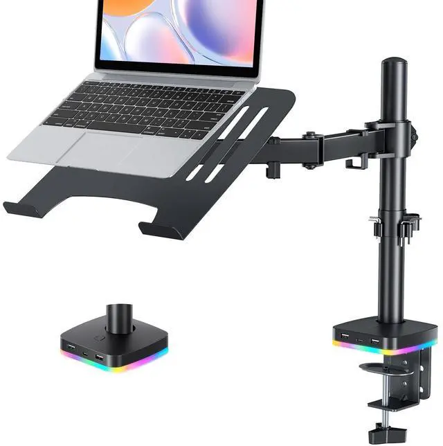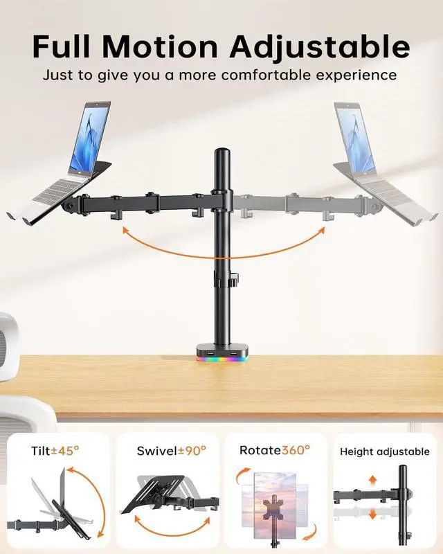 Effects]: The RGB lighting effect design of this monitor stand can be turned on and off with one button, and has a variety of dynamic lighting effects, so that you can immerse yourself in the colorful world at any time. ^^ Full Motion & Ergonomic DesignThe monitor arms extend, retract and easily adjustable on a 15.7 height pole, +/-15 tilt, +/-90 swivel and 360 rotate to adjust viewing angles. It's ideally suited for programming, design, and multitasking etc.. This increases productivity and reduces the need to switch between different applications. Correct posture prevents neck and eye strain. ^^ Ventilated designThe laptop stand is equipped with ventilation holes to allow for extra air circulation and keep your laptop cool, preventing overheating when placed on a monitor laptop stand. ^^ Declutter & Maximize Desk SpaceKeep all your cables neatly organized and out of sight using the removable cable clips on the support arm and center bar. The cable clips effectively organize and protect cables, allowing you to enjoy working, gaming, or watching movies in a more comfortable environment.