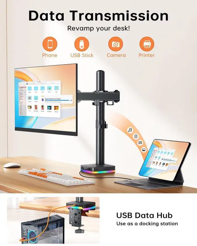 Data Transmission Interface]: The RGB box under this monitor stand has two USB-C ports and two USB ports, which can be used as a USB hub to easily connect peripherals such as keyboards, mice, headphones, cameras, USB flash drives, mobile data cables, and more, eliminating the need to frequently bend down to plug and unplug the host. ^^ [Various RGB lighting