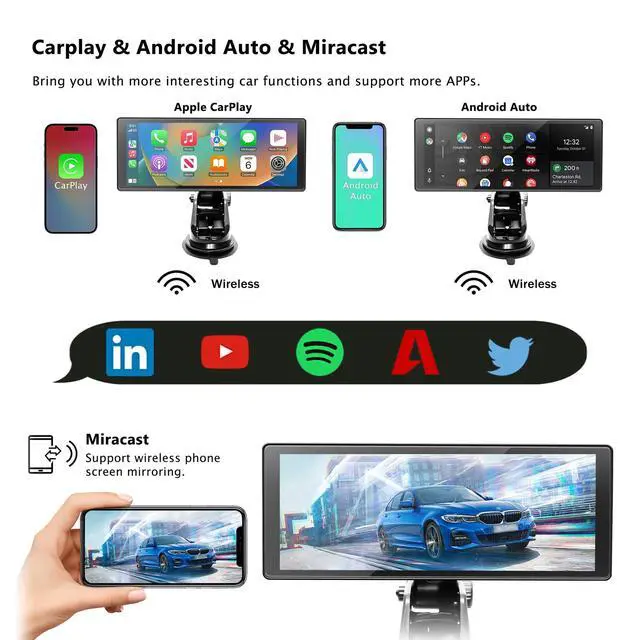 ^^ Easy to install and suitable for all types of vehiclesNo need to disassemble your car's console, keeps your cars original radio, perfect coexistence. Even if your model lacks a USB port, power it up from the cigarette-lighter without hogging space, the car play with screen is suitable for most motor vehicles, such as cars, trucks, vans, buses, pickups, ect. ^^ Bluetooth Car Screen ^^ Map NavigationThe wireless Apple Car Play and Android Auto screen radio enables hands-free Bluetooth calling and music streaming while also providing access to maps, directions and traffic information from your phone through the 10.26 inch carplay screen for safer and more convenient navigation on the go.