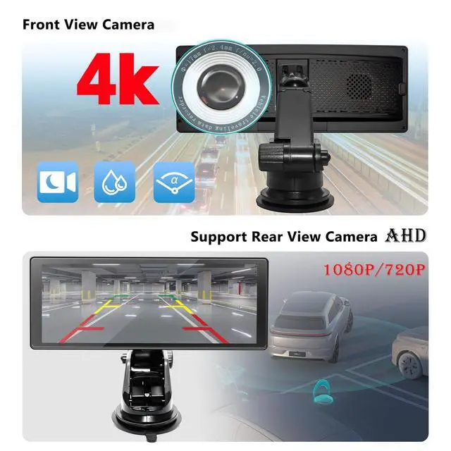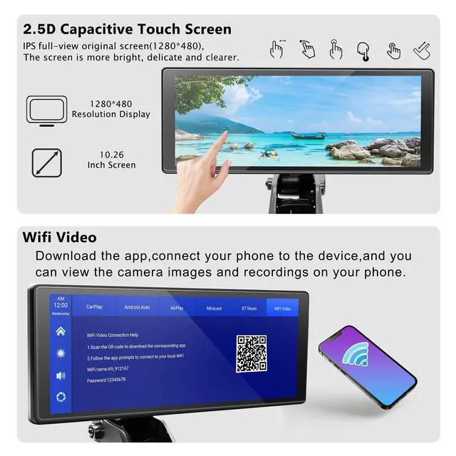 4K/720P Dual Dash Cam Recording This portable carplay screen front 4K and rear 720P cameras, it delivers detailed dual-screen loop recording. With intelligent motion detection and emergency lock, important footage is never lost. You can watch video replays on your phone and never miss any important moments. ^^ Wireless Apple Carplay & Android Auto This portable car stereo supports wireless Carplay/Android Auto. Simply connect with your smartphone via Bluetooth so you can access map navigation, phone contacts, music and more while focusing on the road. When the machine is powered on, it will try to automatically connect to the last connected phone.
