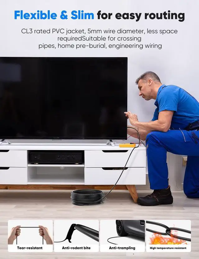 In-wall CL3 rated cables are the most suitable choice for in-wall installations ^^ 8K Fiber Optic HDMI cablehdmi cable 65ft supports 48Gbps High Speed, Mirror, Extend&Game mode 8k@60hz, 4k@120hz. Resolution up to 7680*4320, 3D, Dynamic HDR, HDCP 2.2. Use the 2.1 HDMI Cable, When the scene is switched, the refresh rate will change accordingly to obtain a smoother and more detailed picture, You can enjoy best viewing experience with your family at home. 65 ft HDMI Cable is 8K HDMI Cord 65ft. 2.1 HDMI cord 48Gbps offers an immersive multi-dimensional experience and enhances audio detail depth ^^ Enhanced Gaming ExperienceCompared to 4K hdmi cable, 8K hdmi cable adds enhanced audio return channel (eARC), provides high-definition audio and highest audio quality.