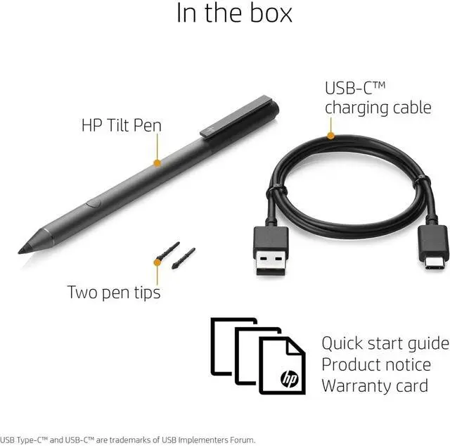 Box: 1 x HP Tilt Pen (2MY21AA / 929863-001)1 x USB-C Charging Cable2 x Replacement Tips1 x