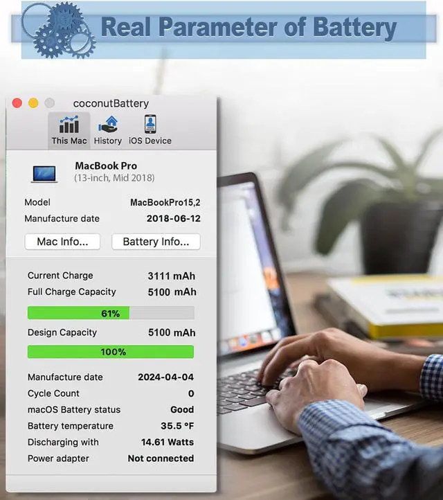 • Fits for MacBook pro 13 inch a1989 battery: Battery Model:A1964. Parameter---Capacity: 5100mAh/58.19Wh, Voltage: 11.41V. Battery Type: Li-Polymer. (Please note: We only sell A-grade batteries. The best grade of batteries produced by the same manufacturer+fully inspected shipment+latest production (weekly updated inventory).)