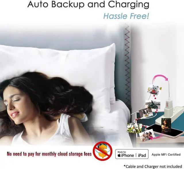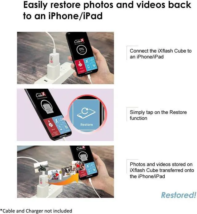 Once connected, the iXflash Cube, with the FREE iXflash Cube APP, will automatically backup all of the photos and videos from an iPhone/iPad while charging the iPhone/iPad at the same time.