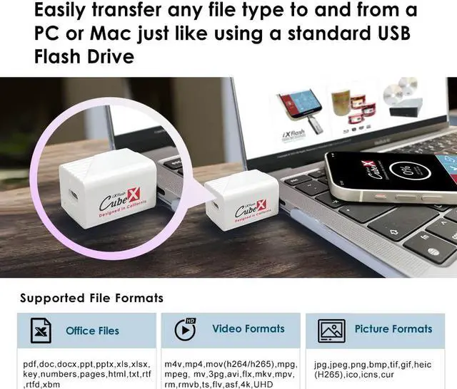 All the content stored on the iXflash Cube can be transferred to a PC or Mac, another mobile device, or virtually any storage device with an active USB Type C connection.