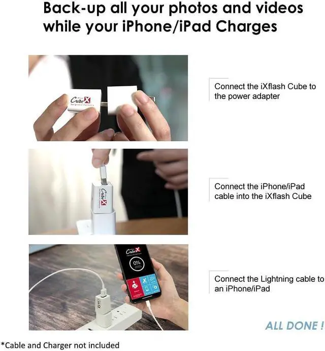 Backup All Photos and Videos while Charging - While your iPhone or iPad is charging, the iXflash Cube will automatically backup all stored photos and videos (including those stored on your iCloud account when connected to Wi-Fi). Wont Repeat - Only backs up images and content not already loaded onto the iXflash Cube. Goes into Dark Mode - To prevent further drain on the iPhone or iPad battery, the iXflash APP can go into dark mode, which reduces power consumption.