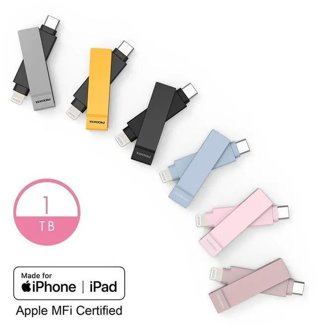 [Dual USB Type C and Lightning Compatibility with USB 3.2 Gen1 Speed] The PioData iXflash 1TB flash drive is Apple MFi certified, ensuring seamless compatibility with iPhones, iPads, and computers. Equipped with USB 3.2 Gen1 technology, it enables fast and efficient transfers for photos, videos, and files, making it the ideal photo storage stick for iPhone users. ^^ [Offers USB-C and a Lightning Connection] Whether you have an older iPhone/iPad with a Lightning connection or the latest iPhone/iPad with a USB-C connection, this dual head USB-C and Lightning iXflash can work with both versions.