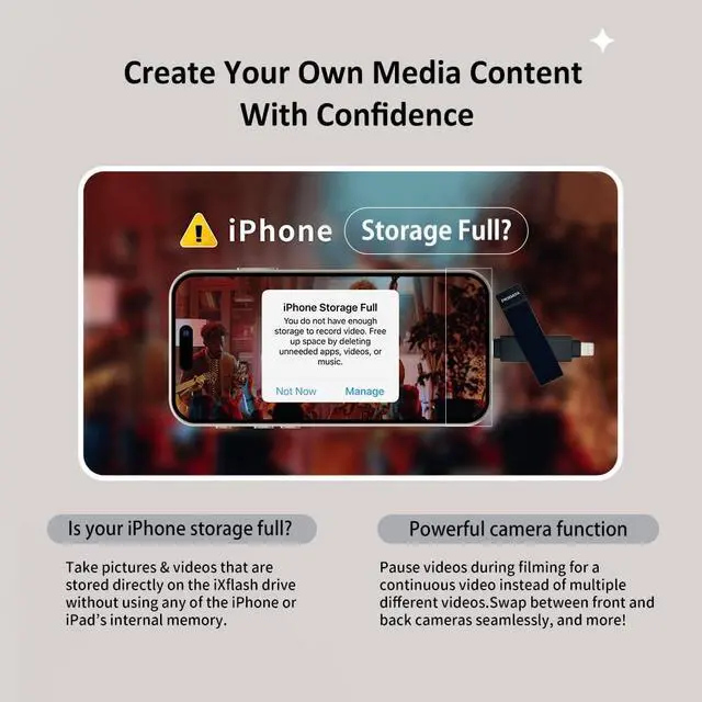 Note: DRM-protected content cannot be stored or played. ^^ [Direct Capture to External Storage] Record videos, take photos, and save Live Photos directly onto the iXflash, bypassing internal storage limits. This feature is essential for travelers and photographers seeking reliable iPhone photo storage. ^^ [Comprehensive File Management] Organize documents, multimedia, and create password-protected ZIP files (. rar,. 7z,. zip). Compatible with formats like PDF, Word, Excel, and PowerPoint, making it an essential storage booster for iPhone users. ^^ [Case-Friendly Design] The extended USB Type C and Lightning connectors fit most iPhone cases, allowing effortless connectivity without removing protective covers. ^^ [True Storage Capacity and Durability] This photo storage stick delivers its full 256GB capacity, ensuring dependable performance for transferring photos from phone to memory stick or saving Live Photos and Burst shots.