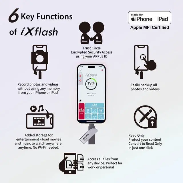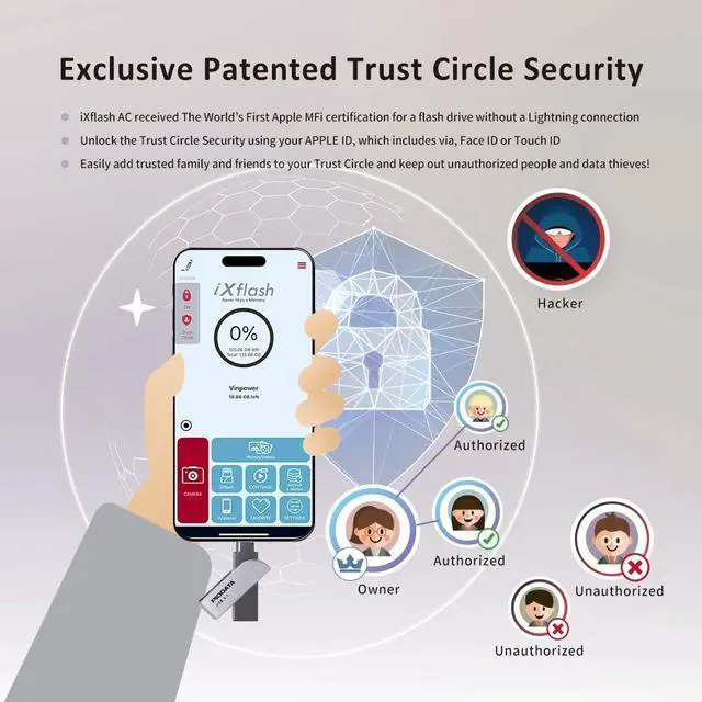 ^^ [No App Needed] - While using the Free iXflash App provides more features and offers more convenience, some users may prefer not to use an App. In that case, the iXflash works directly with nearly all USB Type C connected smartphones and tablets, including the latest iPhone 15 / 16 / 17 or later Series, without an App. Easily plug in the iXflash when the iXflash App is not installed and use it with the standard preinstalled Apple Files App. ^^ [Top-Notch Security with Trust Circle and Read-Only Mode] Featuring the patented Trust Circle AES 256 Key-Lock security system, the iXflash restricts access to authorized users only.