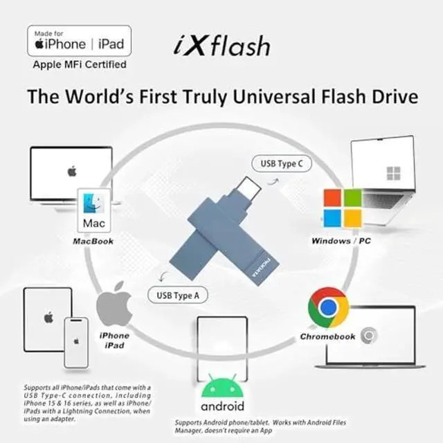 Its also compatible with the latest iPhones and iPads using USB Type C, along with the free iXflash iOS app for effortless usage. ^^ [Worlds first Apple MFi certified Flash drive without a Lightning connection to Backup, Restore, and/or Transfer Files Between Devices] Easily backup and restore photos and videos from your iPhone or iPad while preserving all metadata, such as formats, dates, and locations. The iXflash can transfer all sorts of content, like PDFs, Word documents, and Excel files, between iPhones, iPads, and computers.