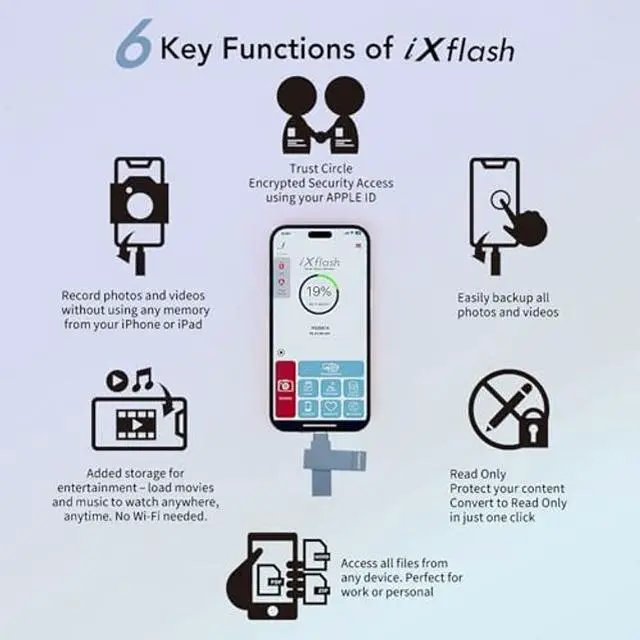 ^^ [Capture Videos and Photos Directly to iXflash] Record videos or snap photos straight to the iXflash, bypassing your iPhone or iPads internal storage. Its perfect for expanding your device's storage without worrying about running out of space. A perfect external hard drive for iPhone photos and videos. ^^ [Intuitive File Management System] Efficiently manage your files with features like creating and opening password-protected ZIP files, like. rar,. 7z,. zip and more. Supported formats include Word, Excel, PowerPoint, PDF, images, and videos. The iXflash is an ideal tool for organizing your files on iPhone, making it an excellent choice for personal or professional use.