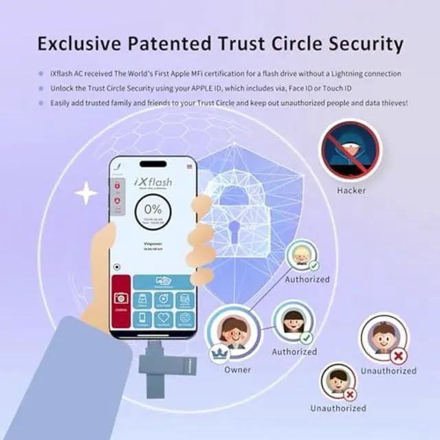 ^^ [Advanced Security with Trust Circle and Read Only Protection] The patented Trust Circle AES 256 Key-Lock security prevents unauthorized access to your stored data. Only authorized users within the "Trust Circle" can access the files, ensuring complete privacy. Additionally, the Read Only feature safeguards files from being modified or deleted and shields the drive from potential viruses, making it a secure USB flash drive for iPhones, iPads, and other devices. ^^ [Play Hi-Res Music Files] Enjoy high-resolution audio files, such as FLAC, directly on your iPhone or iPad using the iXflash app, which provides superior audio quality compared to MP3 files.